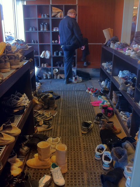 I went to the gym with Del. I had forgotten this Northern Canadian custom. Everyone takes off their snowy or muddy footwear at the door, and puts on their inside shoes. And your shoes are still there when it is time to leave. I wonder if this custom is other places in the world?